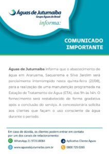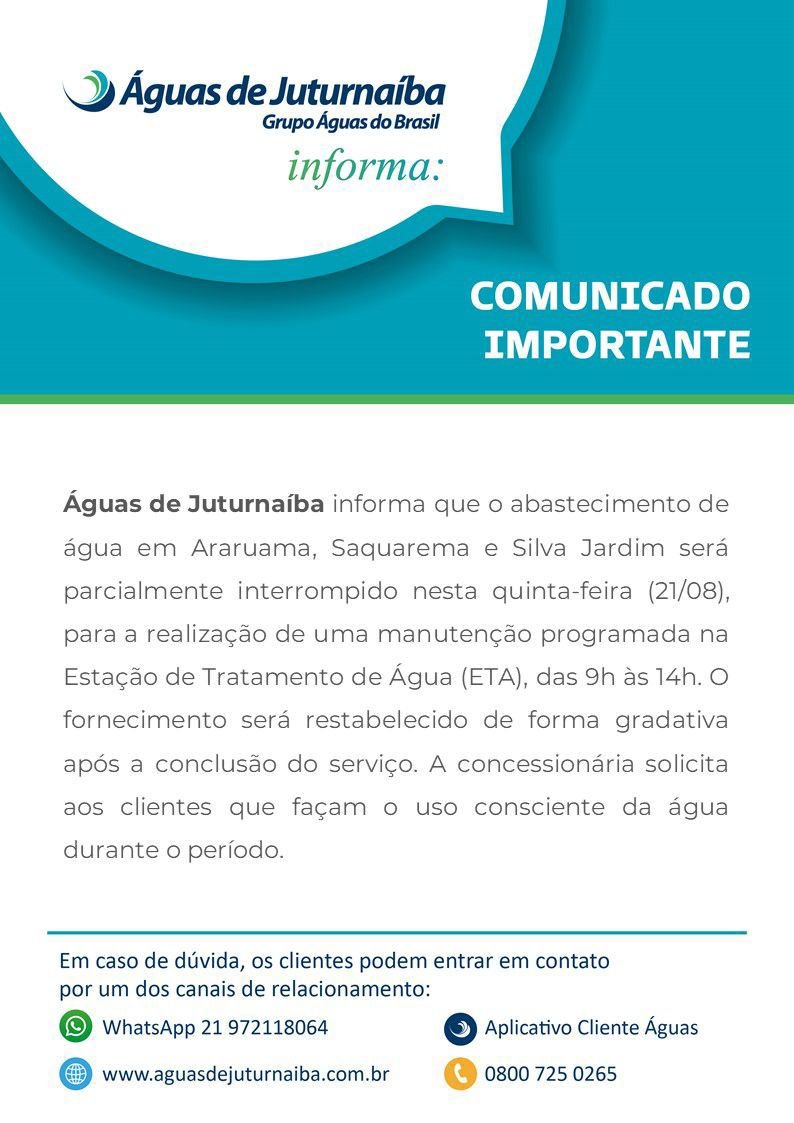 InícioCidadesAraruamaÁgua de Juturnaiba InformaAraruamaSaquaremaSilva JardimÁgua de Juturnaiba InformaBy Redação20 de agosto de 20250108CompartilhadoFacebookTwitterPinterestWhatsAppTelegram Fique atento nesta quinta-feira TagsÁgua de JuturnaibaComunicadoCompartilhadoFacebookTwitterPinterestWhatsAppTelegram Artigo anteriorÁguas de Juturnaíba inicia reforma da loja de atendimento de SaquaremaPróximo artigoServidores aldeenses participam de palestra do TCE sobre Regime Próprio de Previdência SocialRedaçãoRELATED ARTICLES AraruamaAraruama abre oficialmente a 41ª Exposição Especializada do Cavalo Mangalarga Marchador 28 de fevereiro de 2026 AraruamaDetox da Alma, retiro exclusivo para mulheres, comemora 10 anos com imersão em Búzios (RJ), de 20 a 22 de março 26 de fevereiro de 2026 AraruamaAraruama sedia a 41ª Expo Especializada do Mangalarga Marchador, que deve reunir cerca de 240 animais no Parque de Exposições 25 de fevereiro de 2026 DEIXE UMA RESPOSTA Cancelar respostaComentário:Por favor digite seu comentário! Nome:*Por favor, digite seu nome aqui E-mail:*Você digitou um endereço de e-mail incorreto!Por favor, digite seu endereço de e-mail aqui Site: Salve meu nome, e-mail e site neste navegador para a próxima vez que eu comentar. Δ- Advertisment -Mais popularAraruama abre oficialmente a 41ª Exposição Especializada do Cavalo Mangalarga Marchador 28 de fevereiro de 2026 Prefeitura de Maricá promove ouvidoria sobre serviços de abastecimento de água e esgoto 26 de fevereiro de 2026 Niterói é divulgada na Bolsa de Turismo de Portugal 26 de fevereiro de 2026 Detox da Alma, retiro exclusivo para mulheres, comemora 10 anos com imersão em Búzios (RJ), de 20 a 22 de março 26 de fevereiro de 2026 Rio Open 2026 recebe 70 mil pessoas e consagra João Fonseca e Marcelo Melo campeões nas duplas 25 de fevereiro de 2026 Araruama sedia a 41ª Expo Especializada do Mangalarga Marchador, que deve reunir cerca de 240 animais no Parque de Exposições 25 de fevereiro de 2026 Cooperação entre Poderes é destaque na abertura do ano legislativo na Câmara de Niterói 25 de fevereiro de 2026 A Prefeitura de Araruama intensifica ações emergenciais, emite alerta e reforça cuidados após fortes chuvas em Araruama 24 de fevereiro de 2026 Prefeitura de Araruama inicia a entrega dos kits escolares para alunos das séries iniciais, finais e Eja da Rede Municipal de Ensino 24 de fevereiro de 2026 Unidos do Viradouro, com o título de tetracampeã, desfila em Niterói 23 de fevereiro de 2026 Nova conta da Águas de Juturnaíba começa a ser entregue aos clientes. Entenda o que mudou 23 de fevereiro de 2026 Evento Teia Municipal fortalece a Cultura Viva nos territórios de Niterói 22 de fevereiro de 2026 Carregar mais