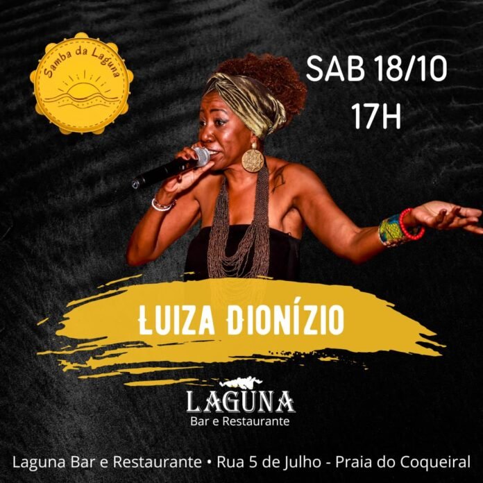 A cantora Luiza Dionísio, um dos grandes nomes do samba contemporâneo, se apresenta neste sábado (18), às 17h, no Bar e Restaurante Laguna, localizado na Rua 5 de Julho, Praia do Coqueiral, em Araruama.
