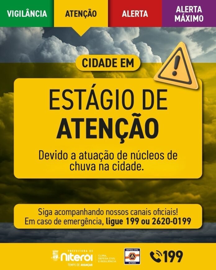 Niterói está em estágio de atenção desde as 16h deste domingo (1º), por causa das fortes chuvas que atingiram a cidade. Até o momento, não houve acionamento de sirenes ou registro de ocorrências graves. Equipes da Secretaria Municipal de Conservação e Serviços Públicos (Seconser) e da Companhia de Limpeza de Niterói (Clin) estão atuando na desobstrução de bueiros, e a NitTrans acompanha a situação para reduzir os impactos no trânsito.