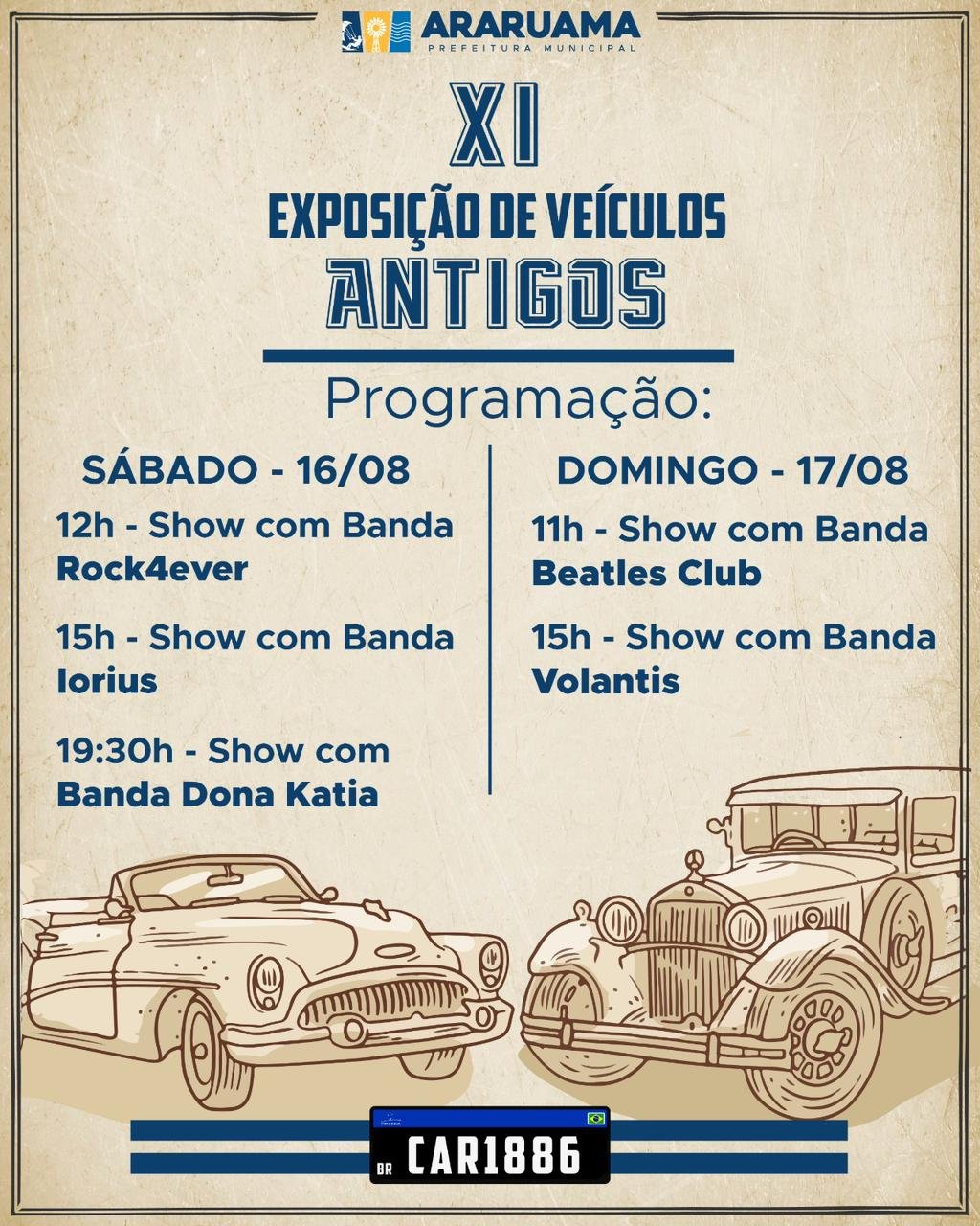Além da exposição de carros, o evento conta com uma programação cultural e musical vibrante. No sábado, o palco será agitado com três apresentações: às 12h, banda Rock4ever; às 15h, banda Iorius; e às 19h30, banda Dona Katia. No domingo, o som continua com a banda Beatles Club, às 11h, e banda Volantis, às 15h.